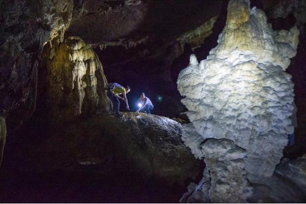 狭窄的洞口稍不注意便会剐蹭皮肤,2米高的洞口需要靠专业的绳索才能上去,腿短的我表示差点费在这里。“你看我额头是不是出血了?”同行的小蒋突然问我,原来他不小心头碰到上方的尖尖的石钟乳,好在伤口不大深埋头发。