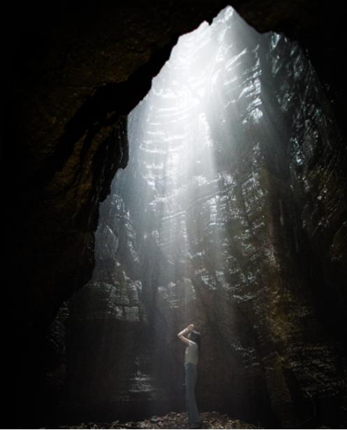 漆黑的洞内突然有一束光亮,原来洞内还隐藏着一个天然竖井,微微光亮从天而降,让深处黑暗的我们仿若隔世。