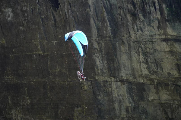 随后飞行员聂玉男、飞行员胡长洲也纷纷从天龙桥底部起飞,彩色的滑翔伞宛若一只雄鹰在空中翱翔后,最后精准降落在指定位置,赢得现场观众欢呼声与尖叫声不断。