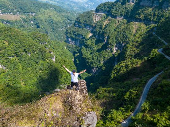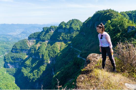 登上顶部,站在悬崖之巅,一览众山小。低头脚下便是沟壑分明的黄莺大峡谷,抬头便可见远处的山脉和蔚蓝的天空。胆大的男同胞坐在悬崖巨石前端,一条腿甚至伸出悬空,直叫人看的胆战心惊。