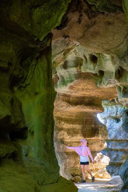 这块巨石初看有点诡异,七个洞门形态相似,均上下窄中间宽,顶尖缩成一个圆形尖端。但每个洞门的纹理又形态各异。洞顶造型怪异,有的像极了骷髅骨架。各色苔藓:红、绿、黄如油墨一般,在岩石四壁铺开,让冰冷的灰色岩石有了些许生机。