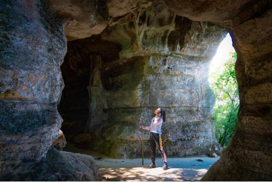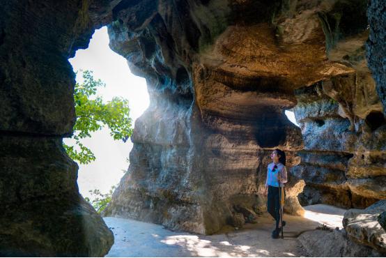 岩石外壁长满了植被。走出最边上的洞门,竟有一条通往石顶的“通道”。说是通道,其实只是可以攀爬而上的石堆和泥土。好奇心驱使我们往上爬,以俯瞰四周的景色。