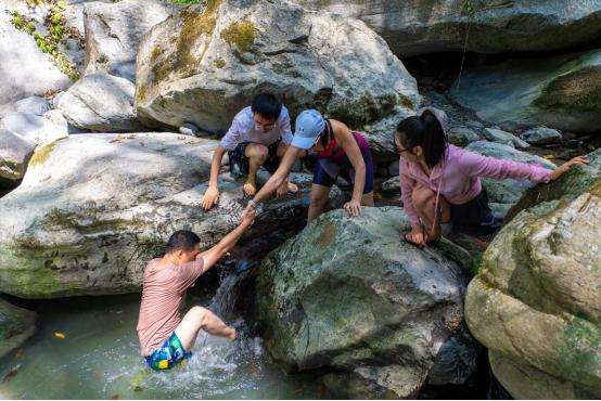 “快看,这里好多螃蟹!”一声雀跃的欢呼吸引着我们一探究竟,一只可爱的螃蟹犹如惊弓之鸟,快速逃离。由于峡谷内生态保护完好,在浅水沟小石块到处都是小螃蟹。重回儿时乐趣,我们都加入抓螃蟹,欢乐声不断。