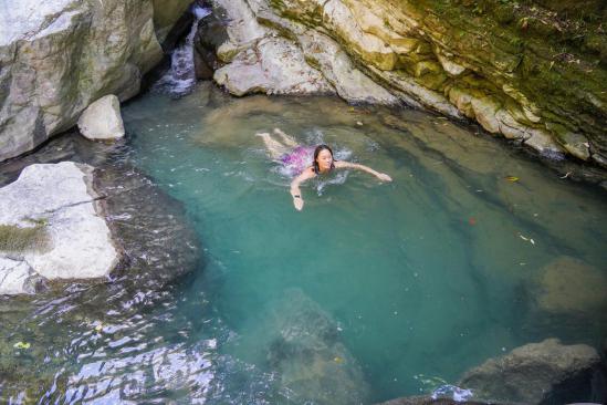 深潭处水质清澈见底,不时可见小鱼穿梭其间。喜欢游泳的美女早就迫不及待跳入深潭,在清泉中自由畅快游泳。