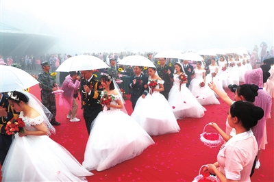 9月28日上午,一场浪漫而庄严的集体婚礼在白马山天尺情缘景区举行。英姿飒爽的66名部队军人携手他们最可爱的新娘,在这里许下爱的誓言,种下爱情树,共赴美好未来。