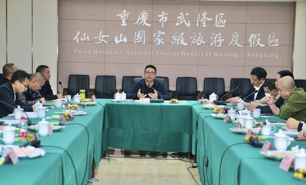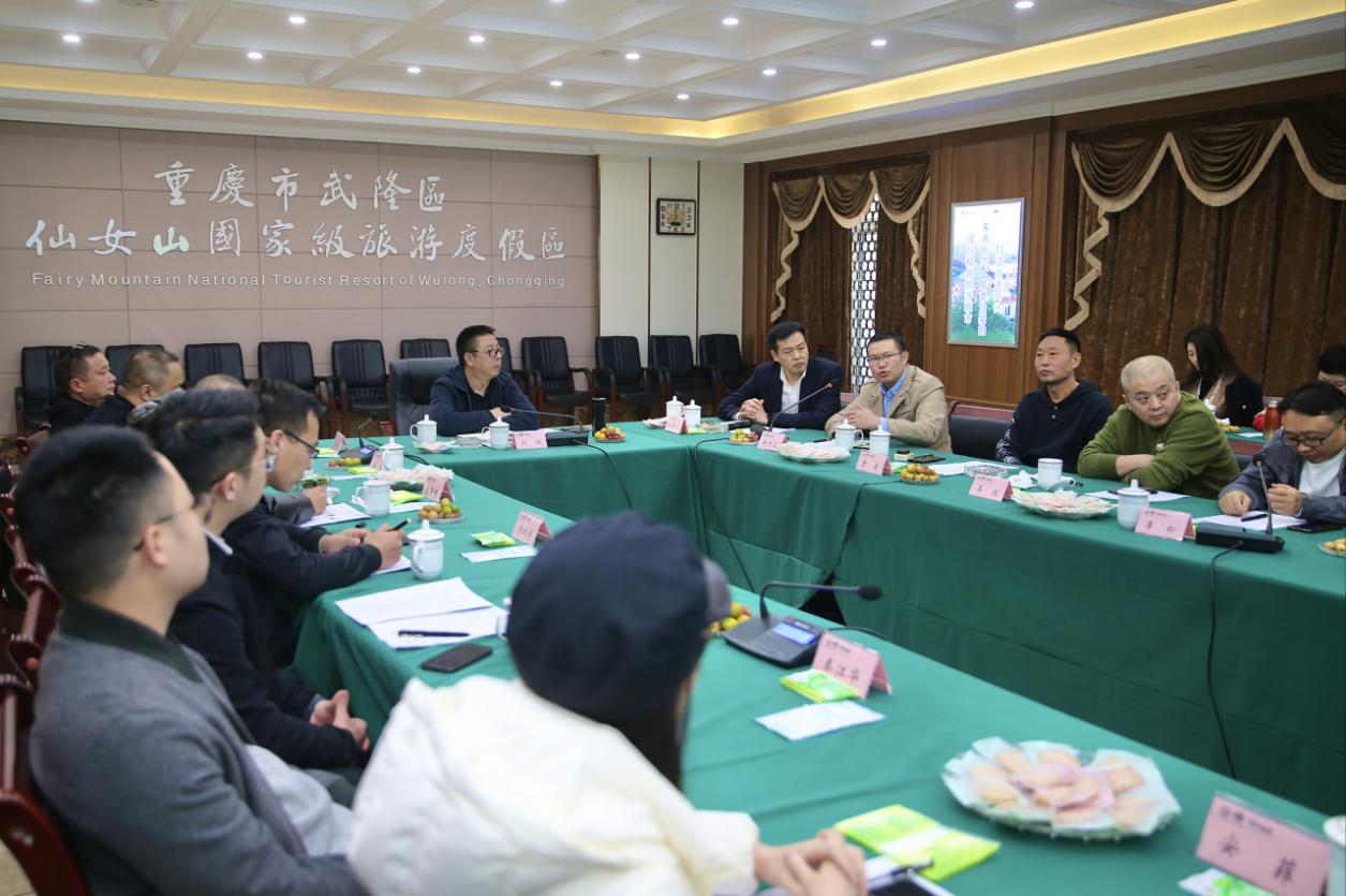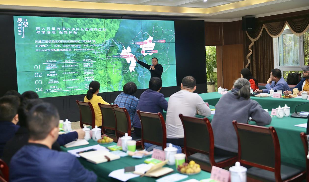 武隆区度假区管委会副主任李邦伦就武隆高端酒店、民宿及营地点位选址作讲解介绍。听完后,酒店、民宿及营地品牌商及意向投资人兴趣满满,纷纷就武隆高端酒店、民宿及营地产业发展意见及建议作交流发言,会议现场氛围融洽。