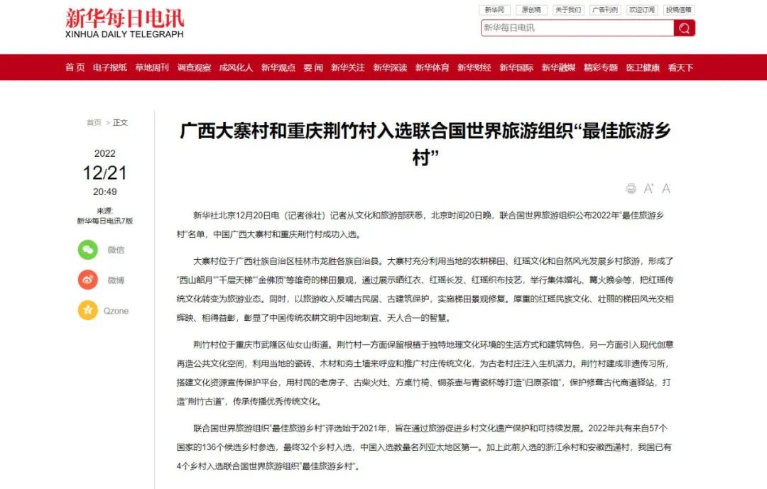 今年国内共有2个乡村入选,全国获此殊荣的也仅有4个乡村,重庆武隆仙女山荆竹村、浙江安吉县余村、安徽黟县西递村、广西龙胜县大寨村,随着联合国官网正式官宣,仙女山荆竹村迅速吸引了全球的目光。
