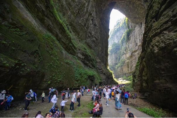 当天,游客们排队前往了天生三桥景区,豁然洞开的天龙桥赢得游客惊叹连连,站在高大山体桥墩下的游客们,被大自然得天独厚的自然风光深深吸引,拍照、录像不停歇。游客纷纷直呼“绝”,山、水、瀑、峡、桥共同构成的一幅完美自然山水画卷,天生三桥神奇美景给大家留下了深刻的印象。