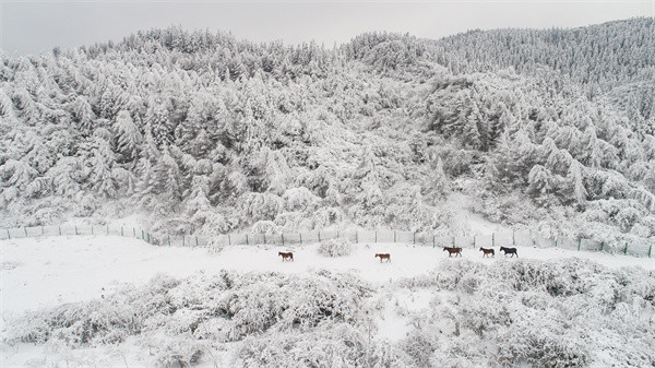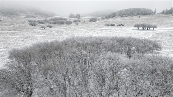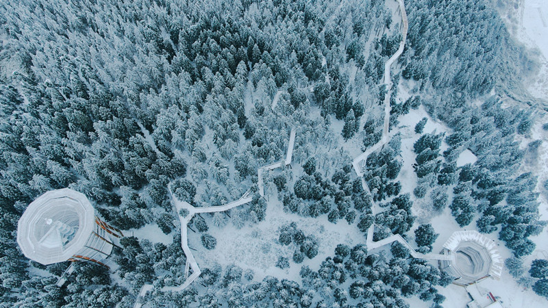 漫天飞舞的白雪,为仙女山披上了绝美的银装,尤其是处于白雪茫茫中的树顶漫步雪景更是与众不同。走在武隆仙女山树顶漫步高空栈道和森林之眼上时,仿佛行走在森林之上;看着触手可及的树顶和一望无际的远方,仿若将世界纳入了胸怀。白雪皑皑,银装素裹,宛若一幅美丽的水墨画。