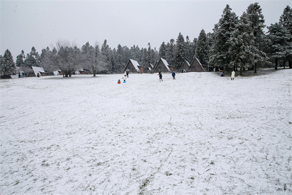 白雪却嫌春色晚,故穿庭树作飞花。春天在仙女山遇见春雪,那是极浪漫的事情。一大早,悄然降临的春雪给游客们带了别样的惊喜,在春日浪漫里,不少游客与春雪撞个满怀。雪花飞舞,漫天银色,大地银装素裹,随便一拍都是美景,景区内到处都是游客们拍照打卡的身影。
