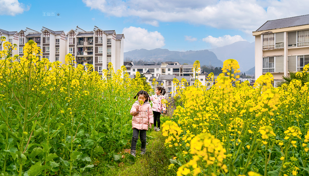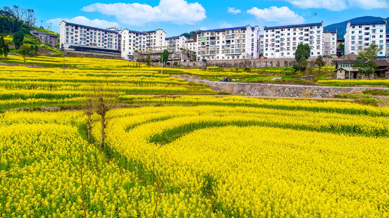 武隆庙垭乡高山多缓坡,村民就因地就势,在梯田上种植成片油菜。阳春三月,层层叠叠的梯田沿着弯弯曲曲的山路铺展开来,万亩“金色油菜花海”诉说着春天的浪漫。远处的青山、附近民房,金黄的油菜花在绿色的梯田映衬下,构成一幅美丽的乡村风光画卷。