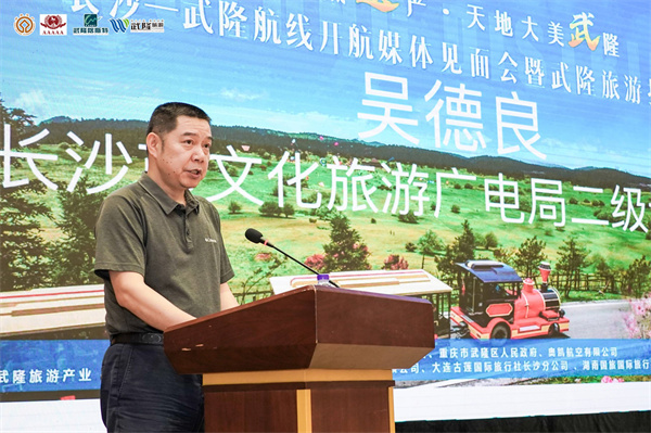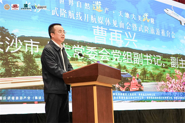 长沙市人大常委会党组副书记、副主任曹再兴在致辞中表示,随着“长沙-武隆”直飞航线的开通,未来两地的联系会更为密切,武隆的美景美食、武隆的热情好客,会让没有到过武隆的长沙市民走进武隆、感知武隆,会让到过武隆的长沙市民再次走进武隆、体验武隆、爱上武隆,同时也欢迎武隆的市民常来长沙做客。