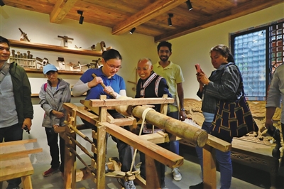 在后坪木器非遗工坊,只见非遗传承人在“车床”上用各种刀具进行切、削、刻等操作,木料飞速旋转,光滑美观的木器初见雏形,吸引了外国嘉宾驻足观看。他们跃跃欲试,在非遗传承人的指导下,纷纷体验了木器的制作过程。来自菲律宾的卢蒙索德加贝斯现场拜师学艺,过了一把“木匠”瘾后表示:“这里的非遗文化不仅有特色,也保存得非常好,我非常喜欢。”
