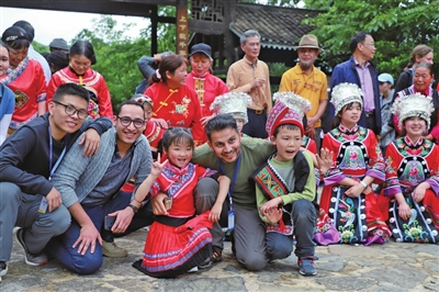 “大河涨水小河满,文凤儿女尽欢颜,留住青山是金山,凤凰飞在彩云间。”汽车刚驶入天池苗寨,一阵嘹亮、欢快的山歌声从寨中飘来。在苗寨门口,外国嘉宾们一下车,身着苗族服饰的苗家阿哥阿妹便载歌载舞、端上米酒热情地迎接嘉宾们。嘉宾们接过米酒,一饮而尽,便与阿哥阿妹一起走进苗寨。