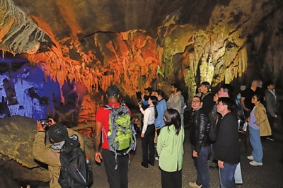 石钟乳、石葡萄、石膏花、石珊瑚……芙蓉洞是武隆三大喀斯特系统之一,以竖井众多、洞穴沉积物类型齐全、形态完美、质地纯净著称,被地质学家评价为“一座斑斓辉煌的地下艺术宫殿,一座内容丰实的洞穴科学博物馆”。外国嘉宾们一走进芙蓉洞中,就被形态多样的沉积物深深吸引,他们仔细观看洞内各类岩溶沉积物,既惊叹大自然的神奇,又为有幸目睹这样神奇的洞穴景观而眉飞色舞。来自美国西肯塔基大学的教授克里斯·葛立夫说,芙蓉洞高度达到上百米,沉积物种类十分丰富且保存得很好,给他留下很深的印象。他表示,将推动美国猛犸洞与中国芙蓉洞两个姊妹洞穴在科考研究、资源保护方面深入合作。