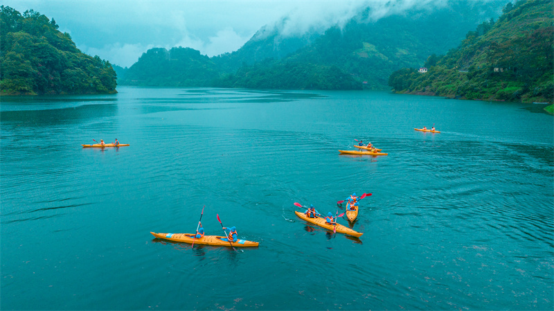 作为重庆首个AP水上探险公园,芙蓉江水上探险公园共设置了水上飞人、摩托艇、水上快艇、休闲皮划艇、休闲大帆船、漂移艇等16个体验项目,现已成为重庆周边水上探险新网红打卡地。既能赏玩绿水青山,又能感受端午节民俗文化,端午期间,一场集运动、观赏、竞技和惊险刺激为一体的浪遏飞舟竞渡赛,吸引了众多游客参与。