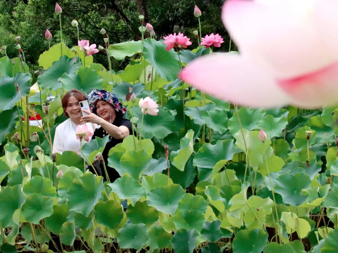 与此同时,上千株颜色各异的睡莲也从水中探出头来,在绿叶簇拥下竞相绽放,让人赏心悦目。游人们三五成群,或骑着自行车环湖赏荷,尽享田园风光;或划着画舫船在湖内穿行,在接天莲叶和清香荷花的簇拥中,感受“接天莲叶无穷碧,映日荷花别样红”的夏日美景。