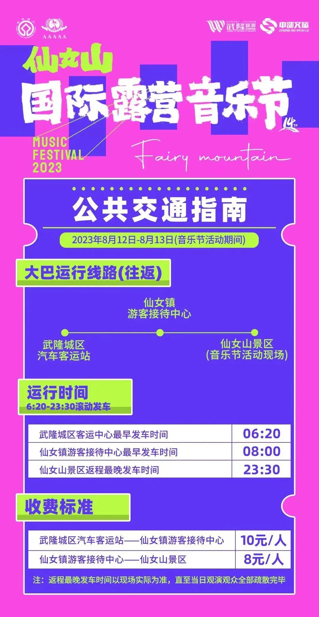 为了保障乐迷朋友们的观演体验,解决音乐节观众的去返程问题,在主办方、景区与交通部门协商后,于8月12日-13日音乐节演出期间,特开通音乐节现场-仙女镇游客接待中心-武隆城区的公交直通专列,班车运行时间最晚至现场观众全部疏散完毕。详细班次信息及收费标准如下图↓