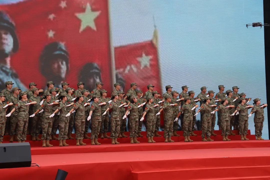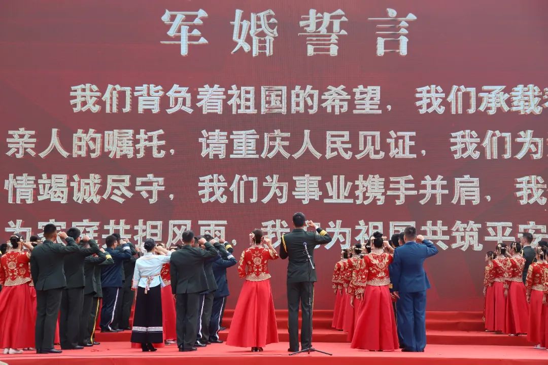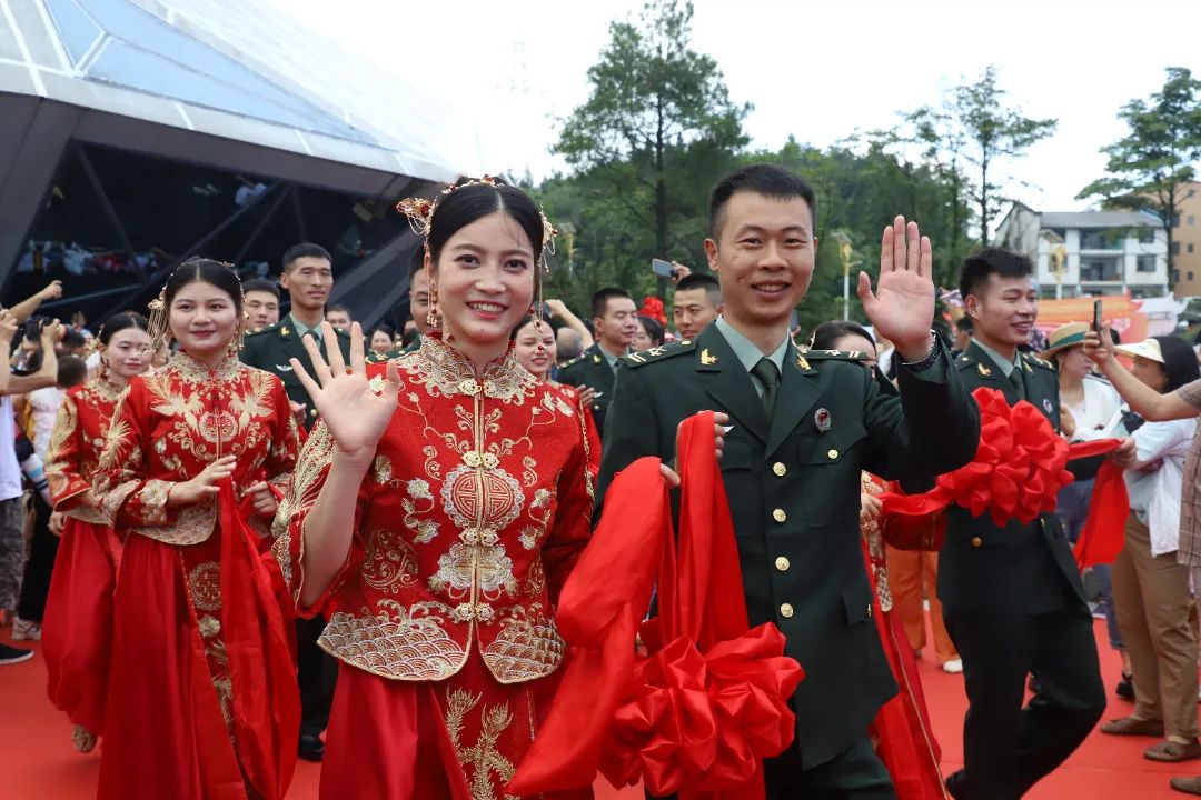8月8日上午,第二届西部边防暨驻渝部队官兵集体婚礼在白马山天尺情缘景区举行,100对新人在众人的祝福下喜结连理,宣读军婚誓言,共同步入神圣的婚姻殿堂。