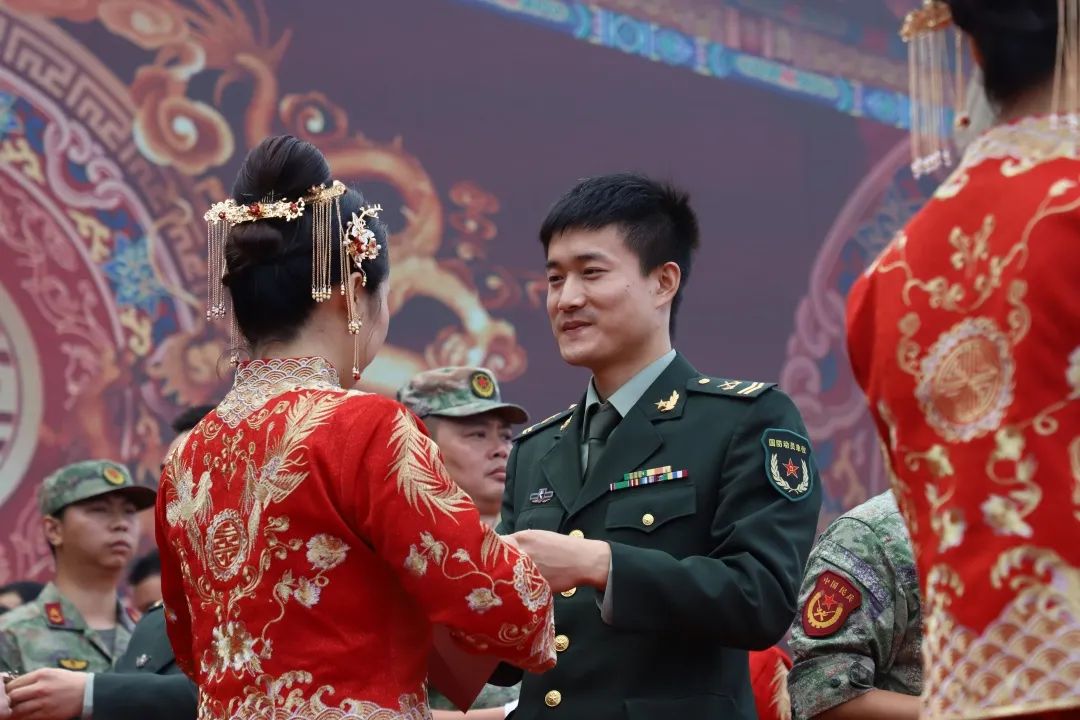 活动中,来自西部边防和驻渝部队各兵种、各岗位的100名官兵们身着礼服,牵着伴侣的手,幸福地步入婚礼现场。互赠礼物,新郎新娘互饮交杯酒,倾听神圣的军婚誓言。
