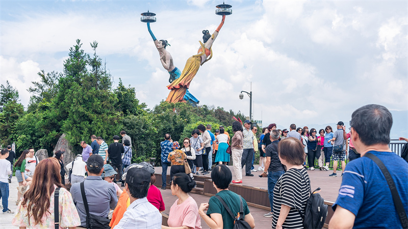 “站在飞天之吻上面,俯瞰下面的风景非常漂亮!重庆武隆之行太值了”印尼游客林海强欣喜的表示。站在由仙女、王子托举着的小亭里,游客们不停拍照留影、尖叫呐喊,印尼游客纷纷点赞白马山之美。