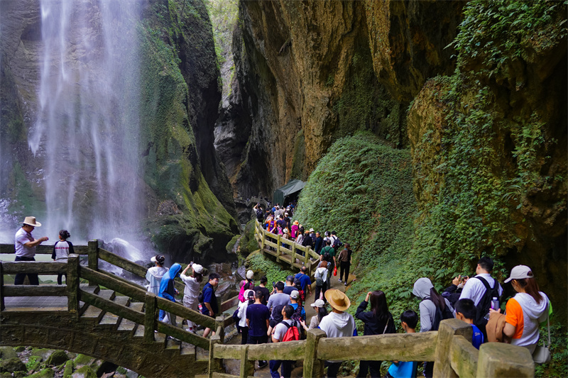 国庆期间,武隆各大景区都穿上了“中国红”新装,喜庆氛围浓厚。在仙女山,游客们同与国旗合影,表达着对祖国的祝福;在天生三桥景区,站在高大山体桥墩下,游客们被大自然得天独厚的自然风光深深吸引;受降雨影响,“地球最美裂痕”龙水峡地缝水量空前,呈现出“飞流直下三千尺,疑是银河落九天”的超壮观景致,令游客们惊叹不已;作为世界唯一被列为世界自然遗产保护地的洞穴——芙蓉洞,每天都吸引着上万游客来此观光澳网官方网站……