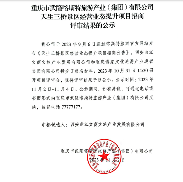 重庆市武隆喀斯特澳网官方网站产业(集团)有限公司 天生三桥景区经营业态提升项目招商评审结果的公示