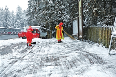 在平均海拔1900米的仙女山景区,大雪纷纷扬扬,覆盖了整个道路和森林。景区出动扫雪车9台、屯工业盐200吨左右、皮卡车3台、撒盐器2台、运盐货车1台,除冰除雪人员23人对主干道进行融雪除冰。