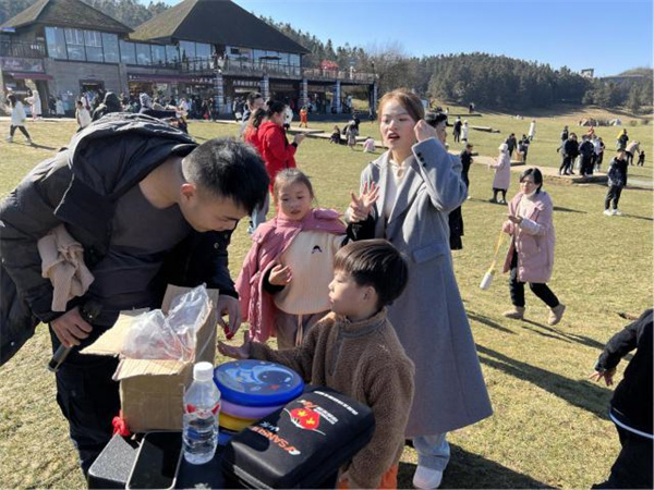 快乐可以传染,笑声不断才是庆新年应有的氛围。仙女山嗨歌音乐会现场,游客们一边唱着好听美妙的歌,一边吹着草原的风,露天KTV吸引不少喜欢唱歌的年轻人在草原上嗨歌。此外,“让兔年飞一会”草原飞盘竞技游戏同样备受喜欢,大人小孩在蓝天白云下奔跑嬉戏,当获胜后收到小礼品后,每个人都洋溢出幸福的笑颜。
