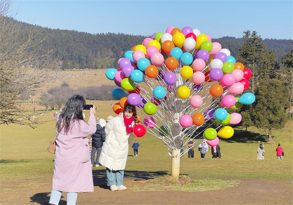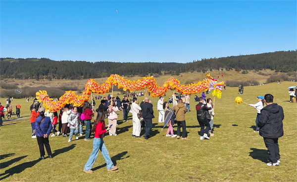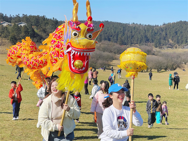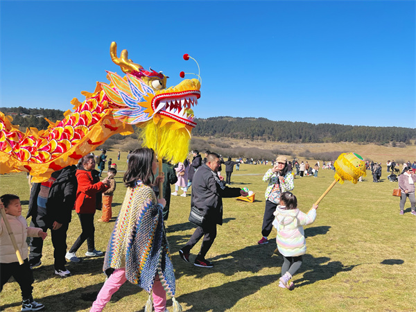12月30日,元旦假期第一天,武隆仙女山景区冬日暖阳高照,节日氛围浓厚。为迎接即将到来的龙年,元旦期间景区每天都在仙女山大草原景区开展“舞龙迎龙年”表演活动,游客可亲身参与舞龙,成为仙女山大草原一道独特的风景线。