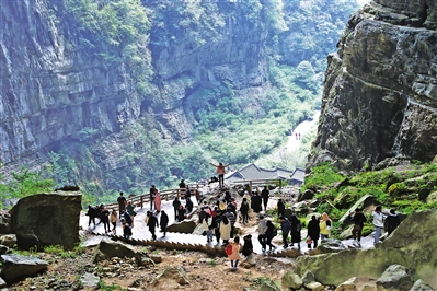 在天生三桥景区,游客朋友文明排队,有序入园。蜿蜒的步游道上一步一景,雄奇险峻的喀斯特自然美景吸引了游客朋友纷纷掏出手机拍照留影,大家纷纷惊叹大自然的鬼斧神工。