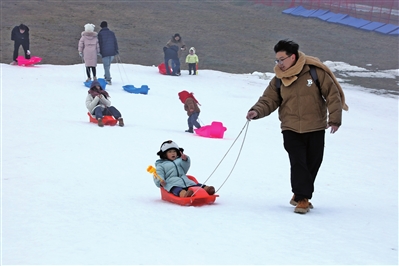 当天,在仙女山室外滑雪场,尖叫声、欢呼声此起彼伏。小朋友们坐在五彩缤纷的滑雪车上,沿着雪坡顺势而下;滑雪爱好者则在教练的带领下练习雪板滑雪的基本动作。大家欢笑着、打闹着,尽情享受着雪上运动的快乐。