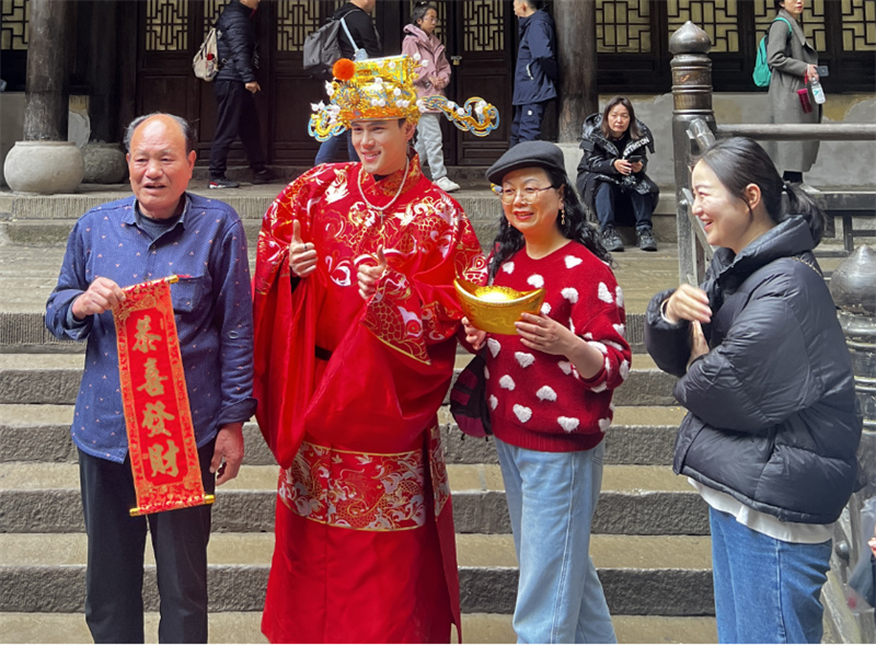 “财神给大家送财啦!”在现场,只见身着大红喜庆衣服、头戴招财帽的财神爷一现身就引发游客围观,浓眉大眼、高挺鼻梁的财神爷吸引众多游客争相接好运。摸一摸财神,沾一沾财气,财神爷摇身一变拿出大元宝,一边发红包一边向游客们传递祝福。