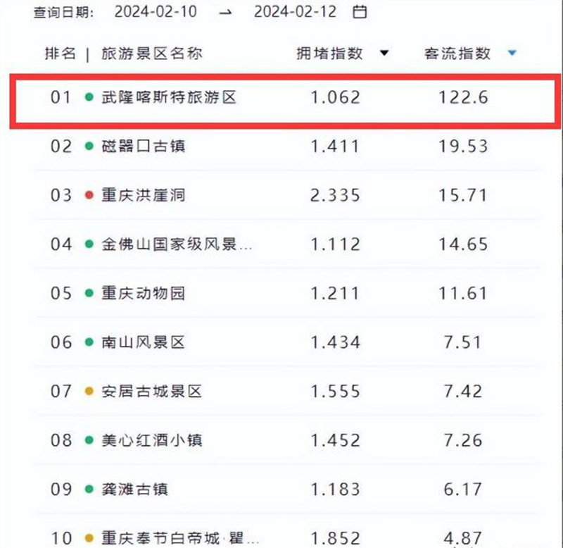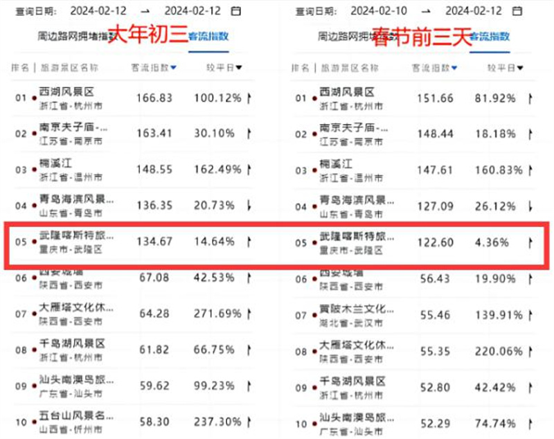 要问这个春节,网红重庆哪个澳网官方网站景区最火爆,武隆喀斯特澳网官方网站区绝对排得上第一。据统计,2024年春节前三天全国重点景区客流排行榜出炉,携手杭州西湖、南京夫子庙、楠溪江、青岛海滨风景区等全国“大佬级”景点,武隆喀斯特澳网官方网站区登上榜单,排名第五,这也是重庆唯一上榜景区。