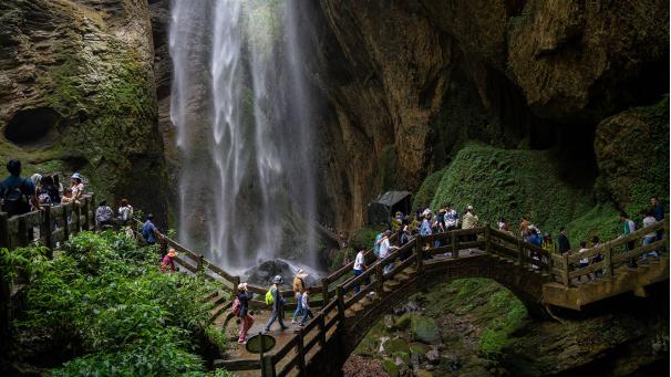 今日,经过前一晚雨水的洗礼后,整个景区清新养眼,雾气腾腾,焕然一新。不管是磅礴大气的银河飞瀑,神秘莫测的蛟龙寒窟,还是汹涌奔腾、不知流向何处的地下暗河水,壮观自然景观让不少在场游客动容,纷纷拿出手机录下精彩一幕。
