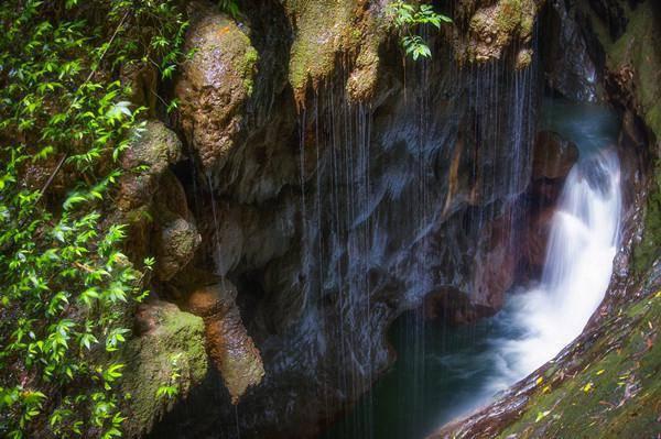 明溪、暗河,耳边水声不绝。碧潭、翠谷,真是移步景换。到处大瀑小布,大的如白布垂挂,细的犹如天女散花,珠点飘洒。出大缝过小桥,顺另一山体下行,沿途仍是上方瀑布时有深沟急流,脚下走的是悬空架设的栈道,叫人步步惊心。