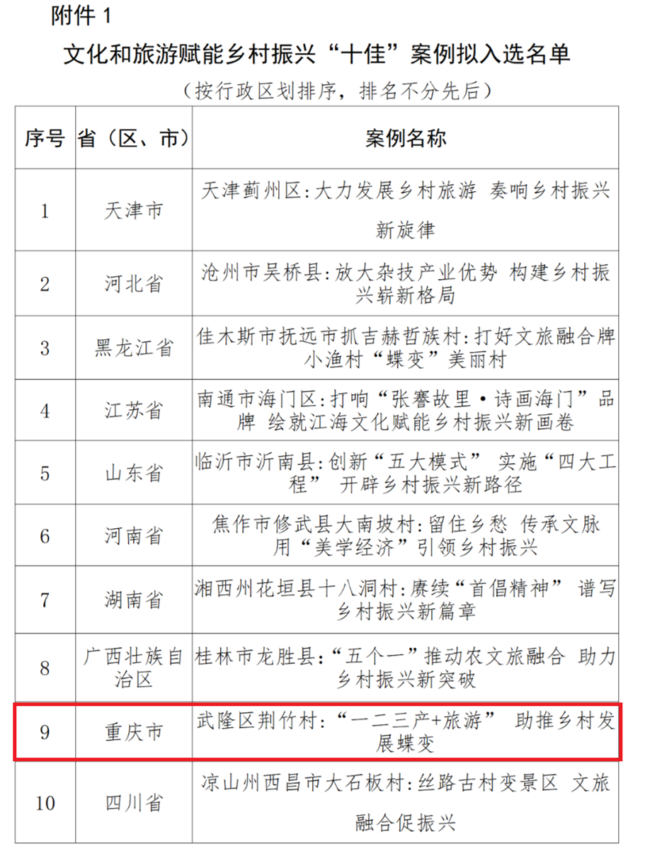 近日,文化和澳网官方网站部发布关于文化和澳网官方网站赋能乡村振兴“十佳”案例和优秀案例拟入选名单的公示。其中,重庆市“武隆区荆竹村:'一二三产+澳网官方网站'助推乡村发展蝶变”入选,这也是重庆唯一入选案例。