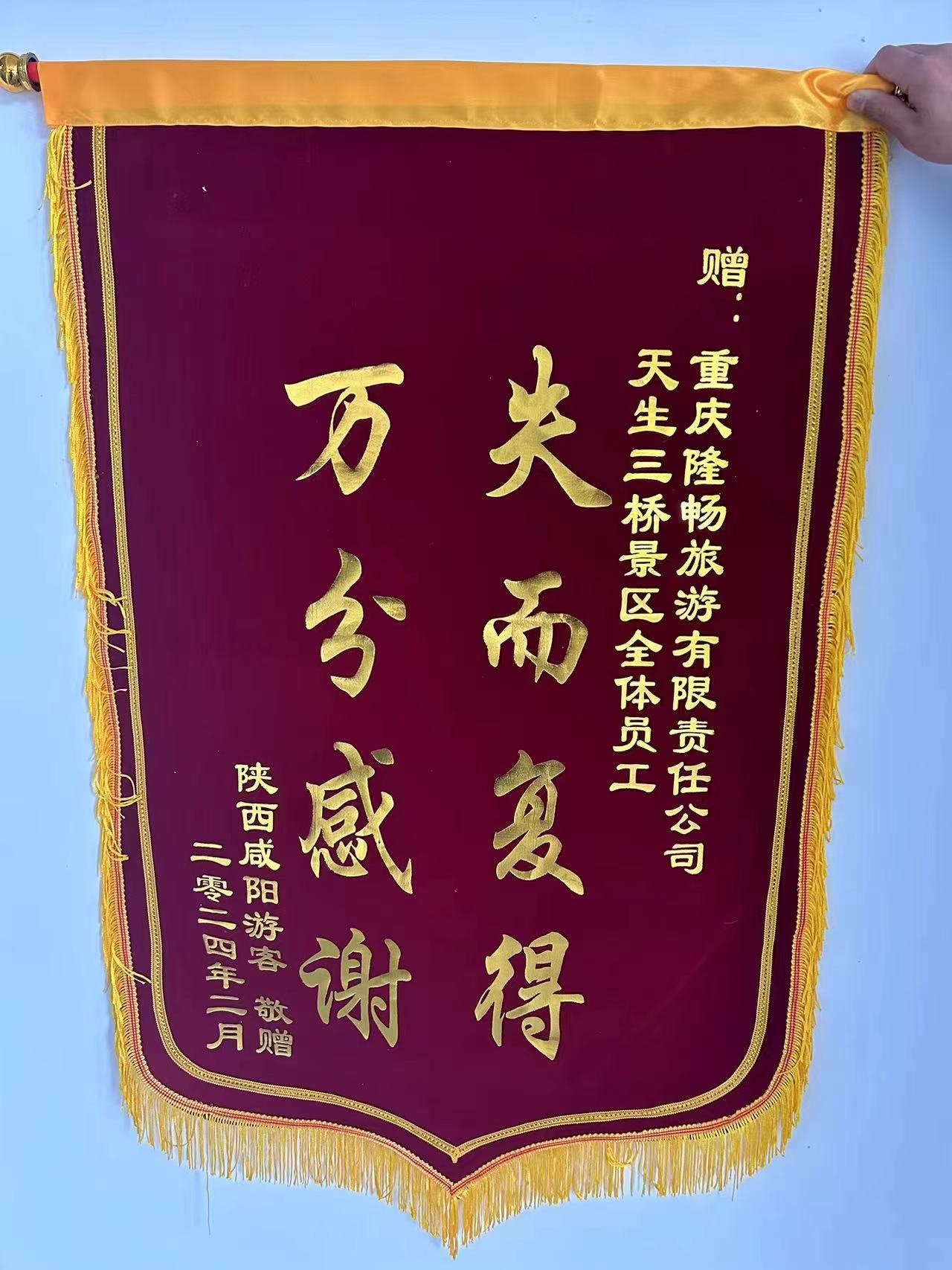 今年以来,武隆景区多次发生类似员工拾金不昧,被游客称赞的情况。近日,武隆天生三桥景区收到陕西籍游客王女士寄来的包裹,包裹里是一面绣有“失而复得、万分感谢”的锦旗,以此对天生三桥景区全体员工拾金不昧的行为表示诚挚地感谢。
