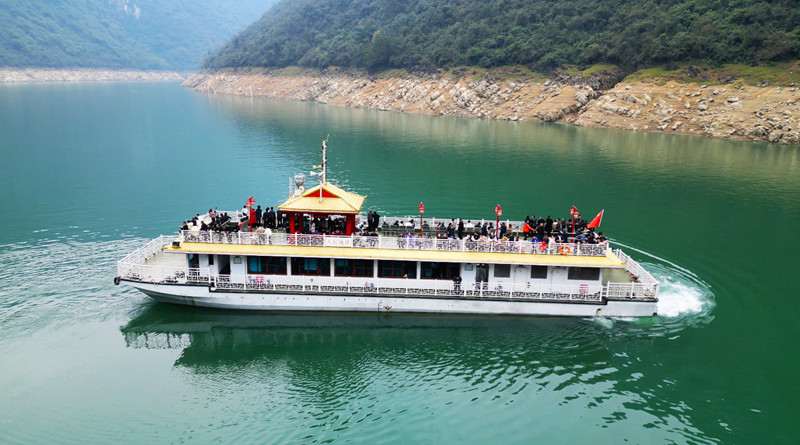 14点30分,游客们换乘观光游轮,在芙蓉江畔上,欣赏着江水碧绿如玉,感受着春天的温暖和宁静。来自浙江的王女士表示,在芙蓉江水上穿行,一幅幅山水画卷在眼前徐徐展开,给人一种“时时皆景,景景不同”的印象,真是"一川游尽画图中"啊!