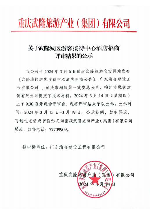 关于武隆城区游客接待中心酒店招商评审结果的公示