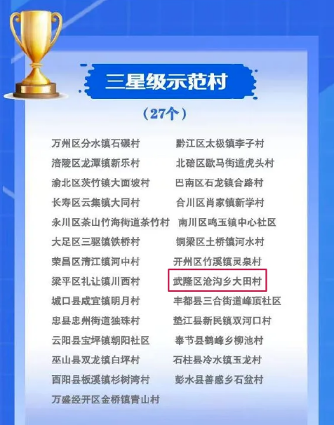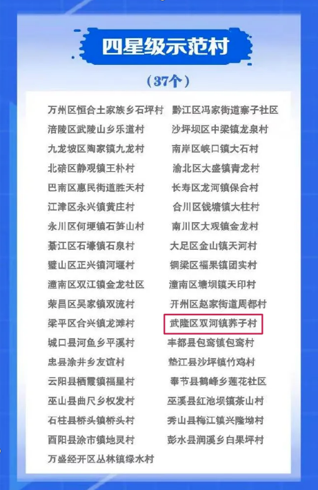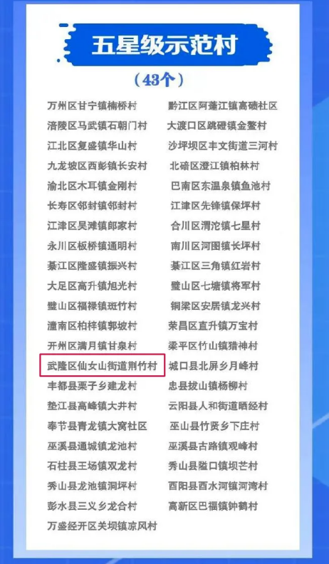 近日,重庆市农业农村委(重庆市乡村振兴局)公布2023年度巴渝和美乡村示范村创建结果,107个村(涉农社区)成功创建巴渝和美乡村示范村,包含五星级示范村43个、四星级示范村37个、三星级示范村27个。其中,仙女山街道荆竹村获评五星级示范村,双河镇荞子村获评四星级示范村,沧沟乡大田村获评三星级示范村。