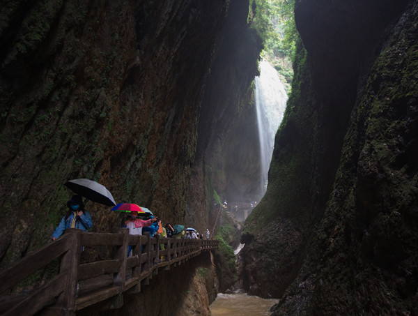 经长年流水不断撞击,在坚硬的岩壁上,冲刷出了一条巨大的凹坑,同时溅起许多水花,产生大量的负氧离子,不少游客在这里驻足深呼吸之后,精神都振奋了许多。来自湖北的简女士赞叹道,“每天生活在钢筋混凝土的城市,看腻了人工雕琢的景点,再看看原生态的龙水峡地缝,银河飞瀑,一线天光,蛟龙寒窟……这里的美景无处不诗情画意,让人流连忘返”。