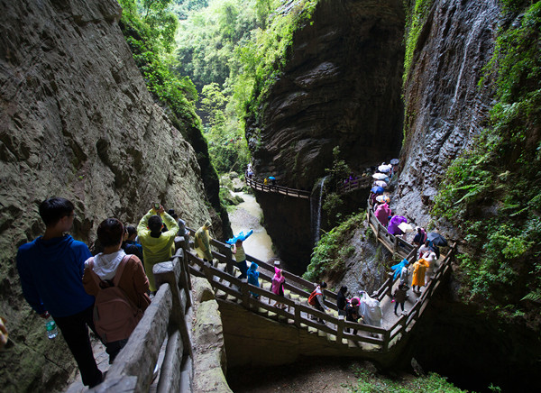 龙水峡地缝是世界自然遗产地核心景区,形如地球裂开的一道深邃缝隙。谷底溪水潺潺,峰谷刀劈斧削,林深木茂,飞瀑流泉,漫游其间,仿佛置身地球心脏,感受地球心跳。