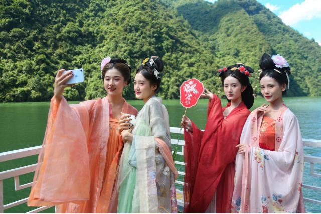 在芙蓉江游船上,景区还将为游客设置汉服穿着和体验活动区,游客可以免费租赁汉服在景区打卡拍照,还可以参与赏花、射箭、投壶、套圈、跳绳等活动,在这里,您不仅可以欣赏到汉服的华美,还可以亲手体验制作传统手工艺品,如刺绣、扇面画等,感受中国传统文化的深厚底蕴。