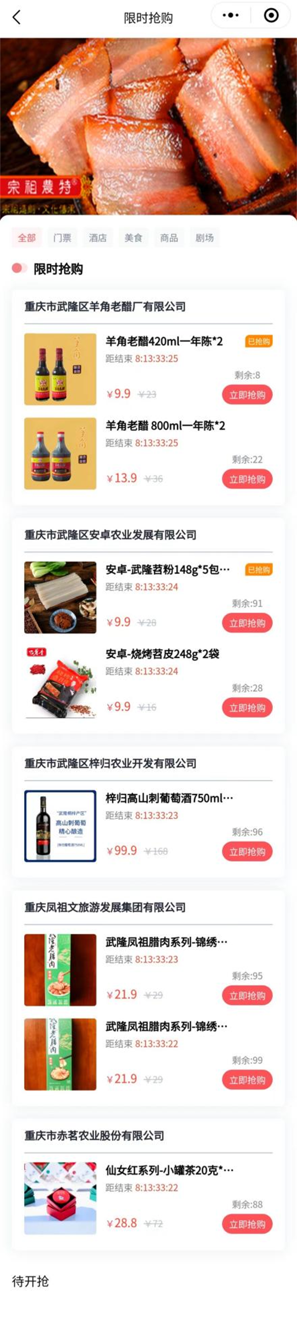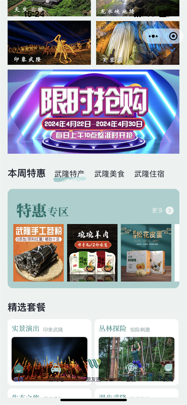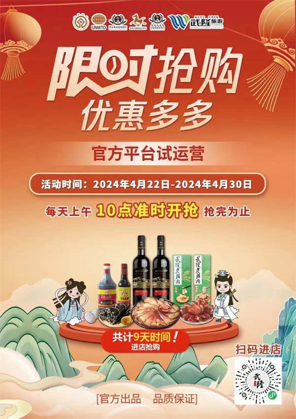 限时抢购!作为目前武隆唯一武隆景区官方平台,已上架景区景点10 个、住宿类商家20家、餐饮类商家16 家、文创特产类商家31家,共计上架产品300余个。为实力宠粉,平台特别于2024年4月22日-2024年4月30日,上线武隆特色产品特惠专区,每天上午10点整限量抢购酒店、美食、特色商品、餐饮品类,如蜡染、印象武隆文创、羊角老醋、腊肉腊排、巴山峡川古树茶、武隆老鹰茶等经典产品,售完即止,快来加入这一场低价狂欢!