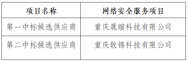 原第一中标候选人重庆蕴明科技股份有限公司因自身原因,自愿放弃本次中标候选人资格,现由第二中标候选人重庆晟暄科技有限公司顺延为第一中标候选人。
