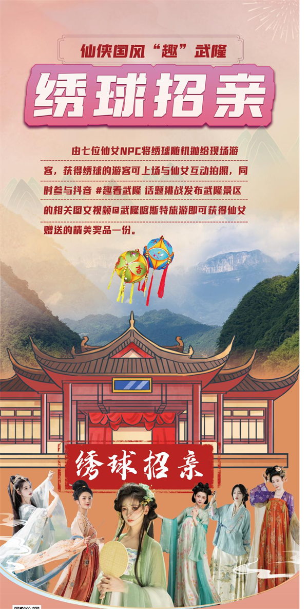 “叮~”您的五一小长假已到账,您收拾好行李选择好目的地做好澳网官方网站攻略了吗?今年五一,武隆景区别出心裁,推出以“仙侠国风趣武隆”为主题的景区活动,仙女游园、捕快巡游、套圈投壶、有奖话题挑战赛等轮番上演,其中最让人期待的便是当下最火的“抛绣球择郎君”招亲盛典,七位超高颜值小仙女,将降临武隆景区择郎君“寻奇缘”,诚邀游客共赴一场古典与现代交融的浪漫之旅。