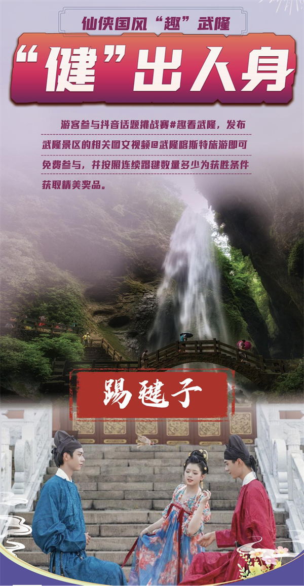 为了让游客能有一场难忘的旅行,景区还设置了超多创意游戏。与七仙女剧本杀,跟黑衣巡捕躲猫猫,接绣球做新郎,互动送糖果,玩古风游戏套圈投壶踢毽子赢精美小礼品,只要你参与抖音话题挑战赛#趣看武隆,发布武隆景区的相关图文或视频@武隆喀斯特澳网官方网站,即可免费参与。