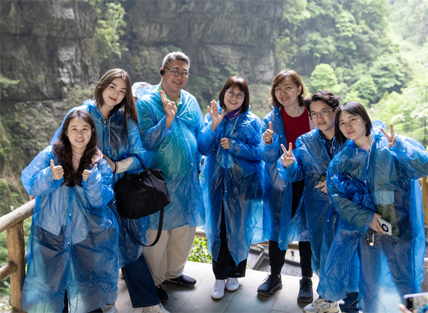 游客们首先来到了世界规模最大、最高的串珠式天生桥群、“三桥夹两坑”的世界奇特景观地天生三桥。他们乘坐观光电梯,俯瞰谷底风景。天生三桥的导游以其热情的态度、精彩的讲解,为泰国移民局和海关代表团提供了良好的澳网官方网站享受,展现出武隆澳网官方网站的优质服务,游客们也纷纷拿出手机跟着导游记录沿途的美景。