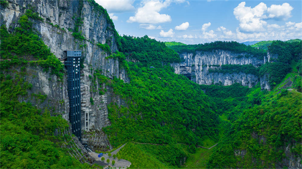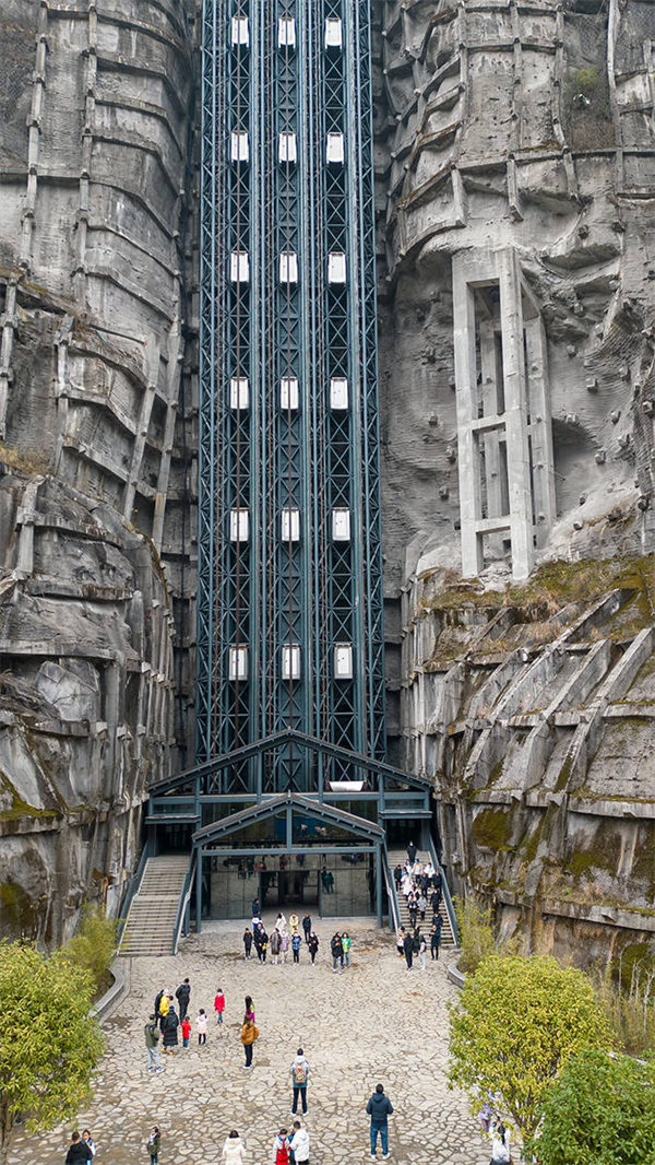 天龙旋梯是天生三桥景区一道靓丽的风景线,建设于景区内的悬崖绝壁之上。从远处看,一个个透明的轿厢如同时空胶囊,直抵天生三桥地心,似是“三体”同款太空电梯,满满的科幻大片既视感。